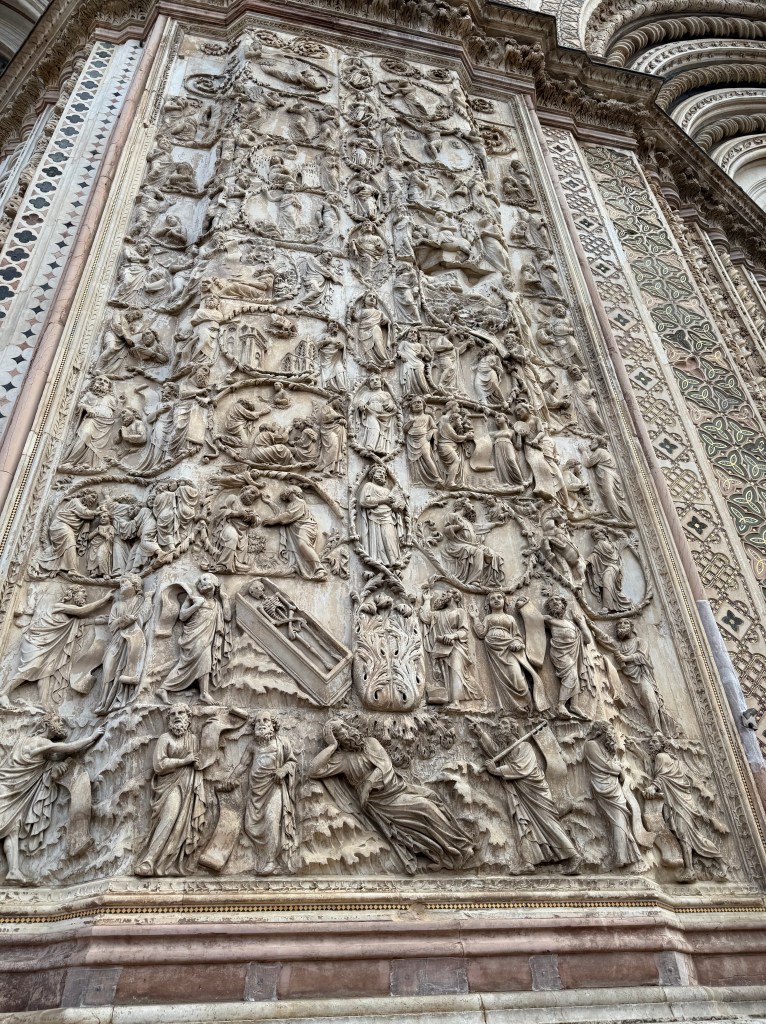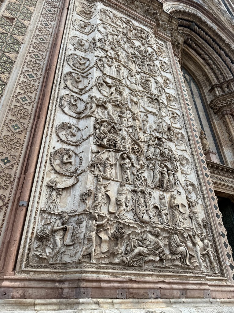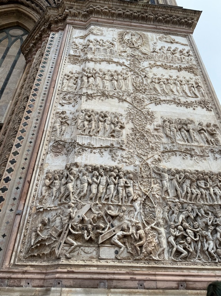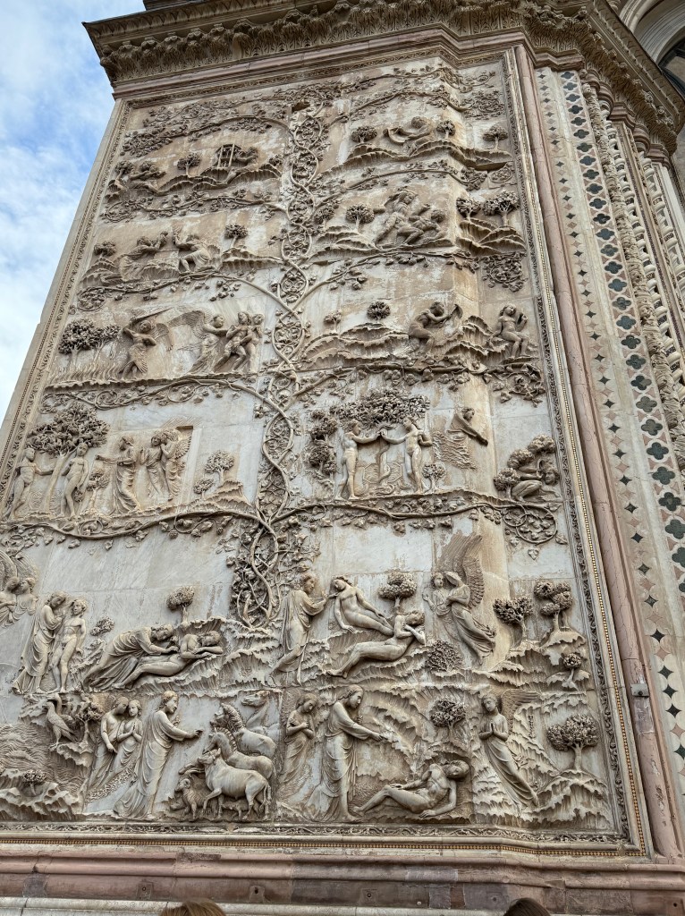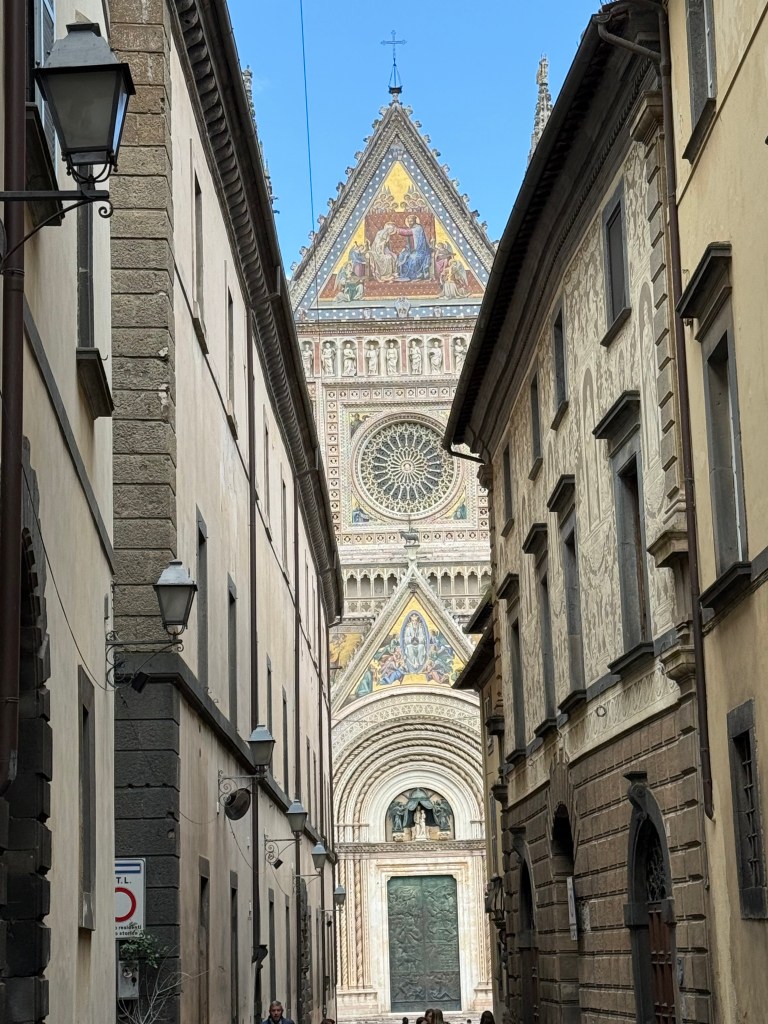 Left Rome early and met up with our bus driver, Eric. Got the baggage loaded and began our little journey towards Orvieto. It is a little city on top of a rock cliff with a medieval cathedral dedicated to the assumption of the Virgin Mary. When we reached the Orvieto railway station we took the funicular to the top of the hill. Where we met our guide Elena who led us through the church and pointed out all of the architectural features of the facade of the cathedral. The art work both inside and outside the building tells the stories of the Bible in a graphic form that was understandable to all. The four columns on the outside of the church represented Creation of the Earth, the genealogy of Jesus, the life of Jesus and the last judgement from the book of Revelation. After touring the church we were on our own to explore the little village. Nick and I chose to walk to the top of the clock tower, wander down some narrow streets and treat ourselves to gelato.