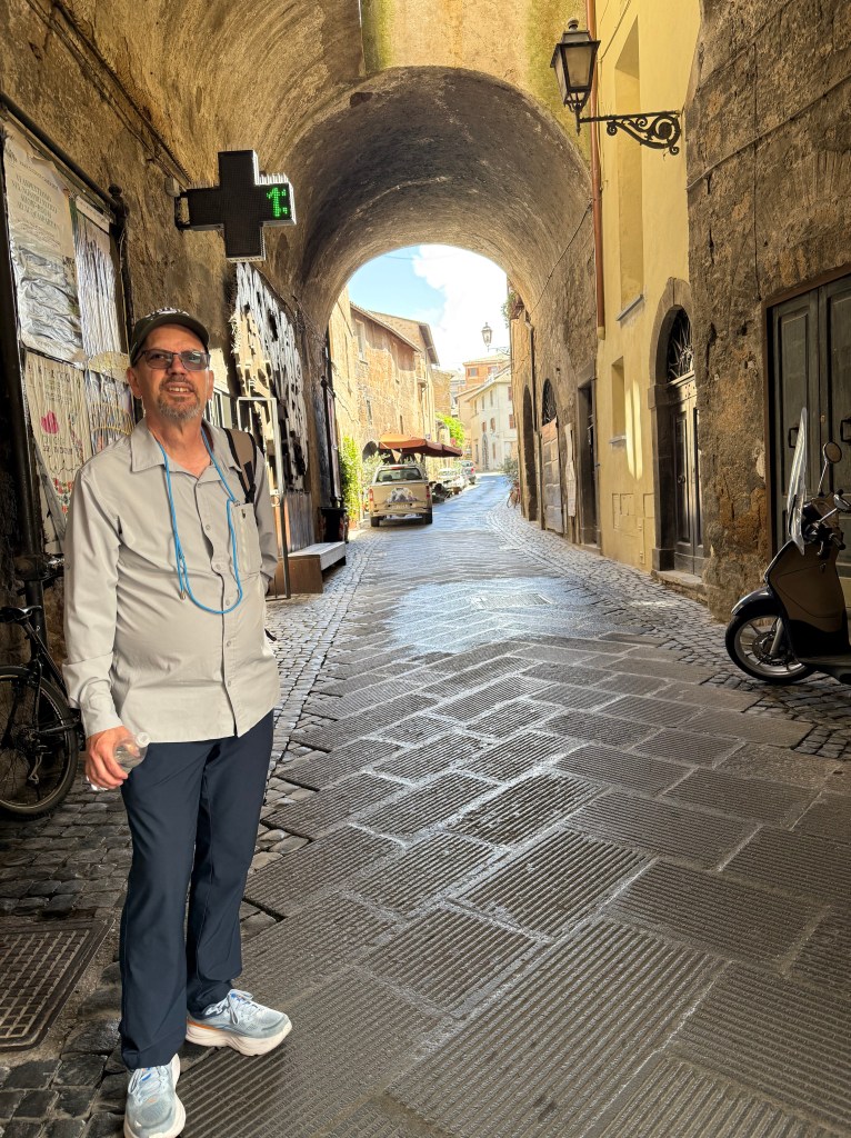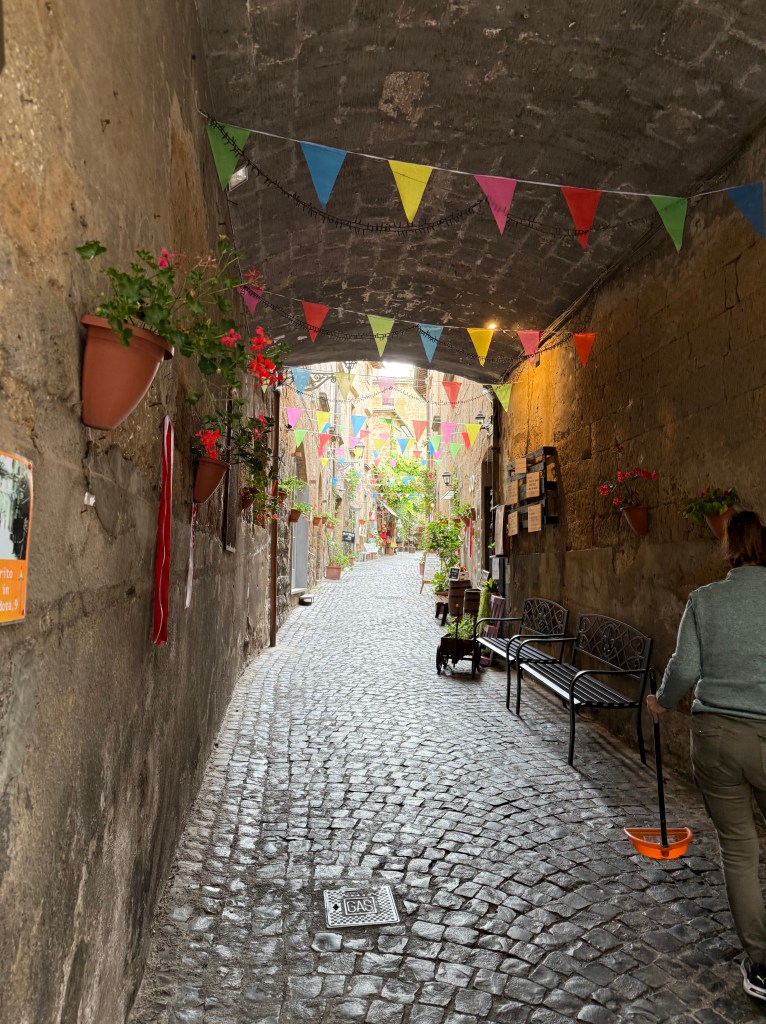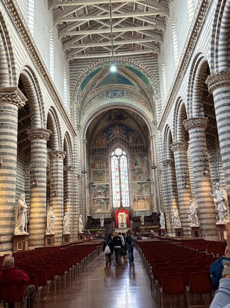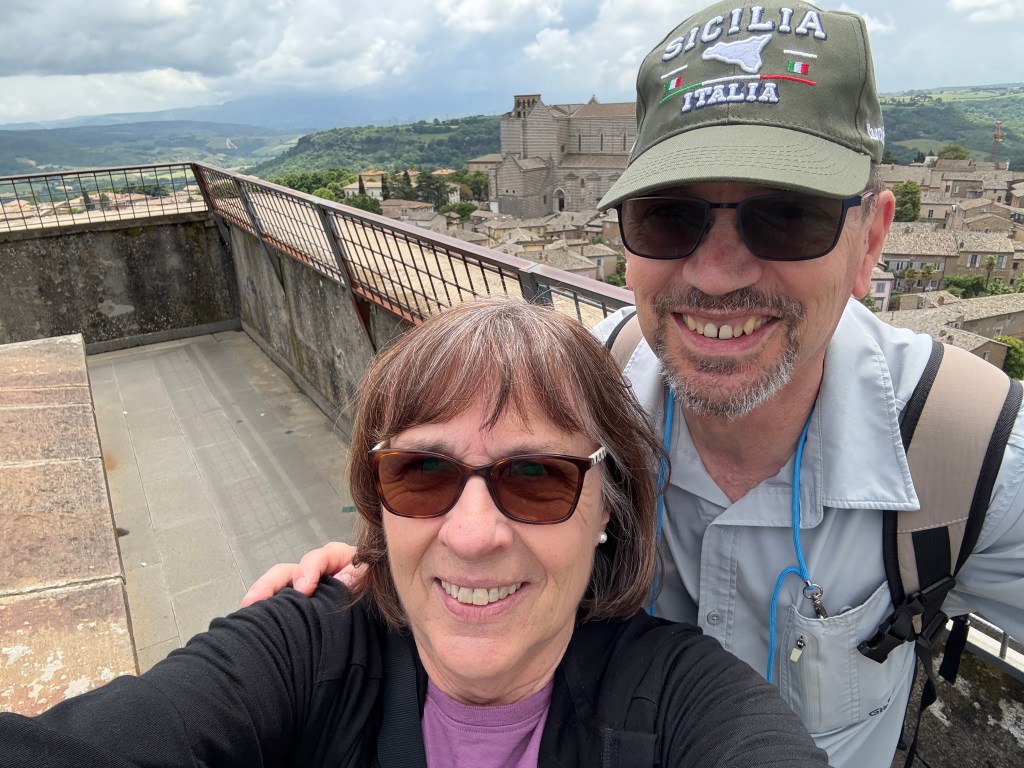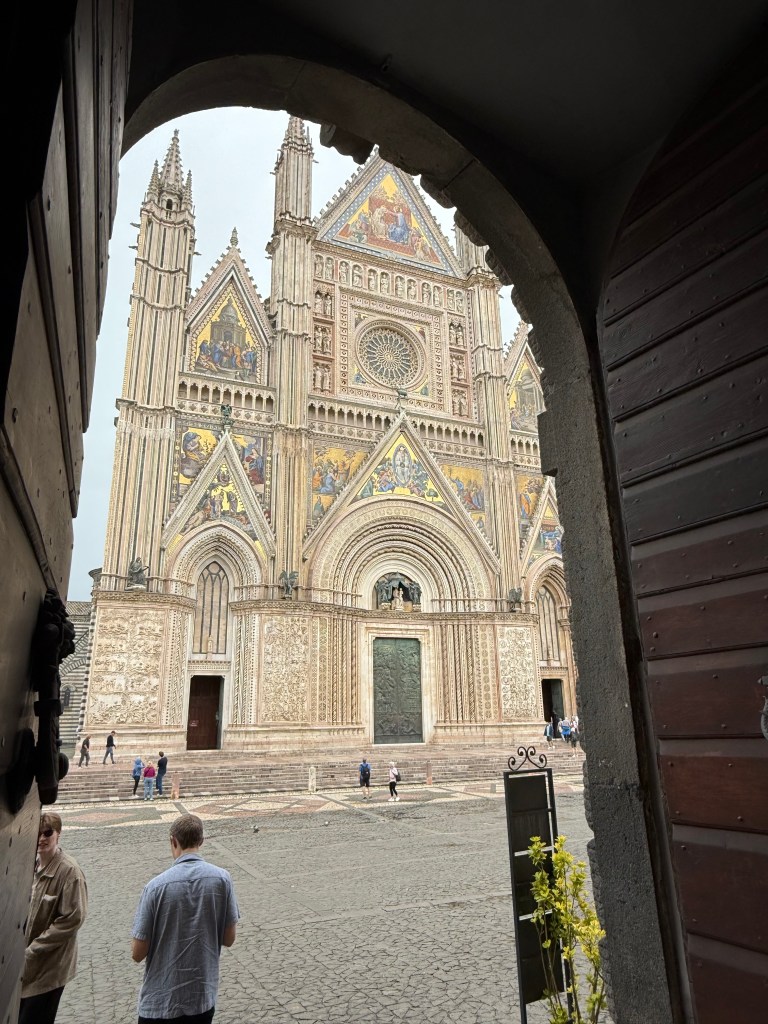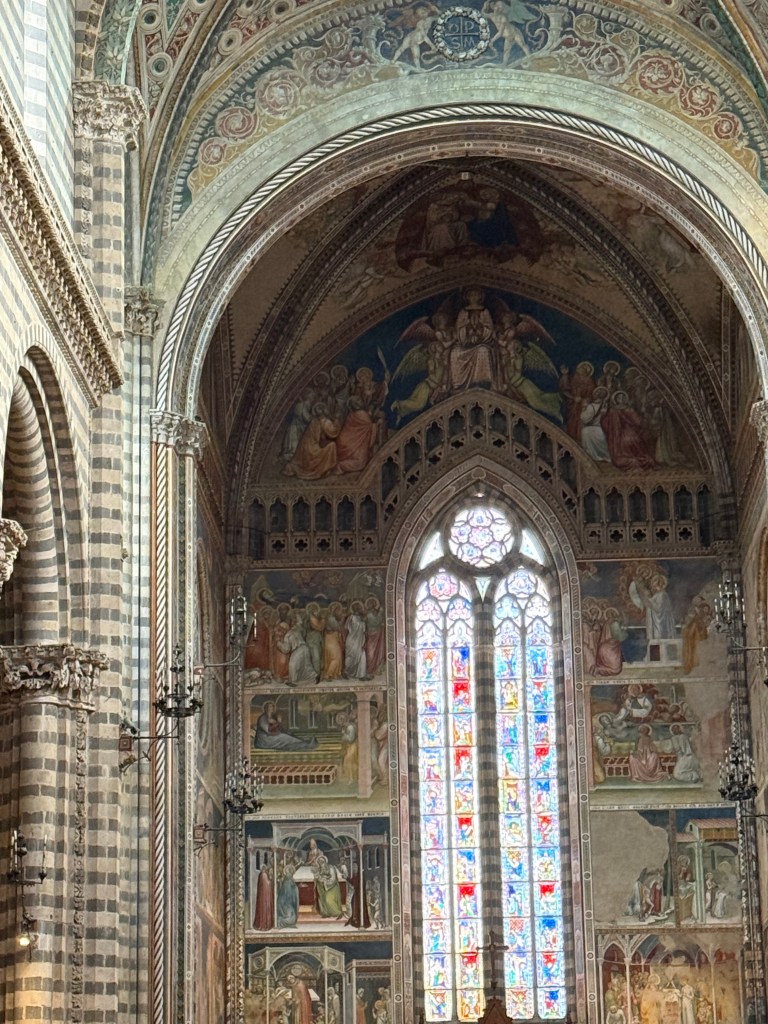 Left Rome early and met up with our bus driver, Eric. Got the baggage loaded and began our little journey towards Orvieto. It is a little city on top of a rock cliff with a medieval cathedral dedicated to the assumption of the Virgin Mary. When we reached the Orvieto railway station we took the funicular to the top of the hill. Where we met our guide Elena who led us through the church and pointed out all of the architectural features of the facade of the cathedral. The art work both inside and outside the building tells the stories of the Bible in a graphic form that was understandable to all. The four columns on the outside of the church represented Creation of the Earth, the genealogy of Jesus, the life of Jesus and the last judgement from the book of Revelation. After touring the church we were on our own to explore the little village. Nick and I chose to walk to the top of the clock tower, wander down some narrow streets and treat ourselves to gelato.