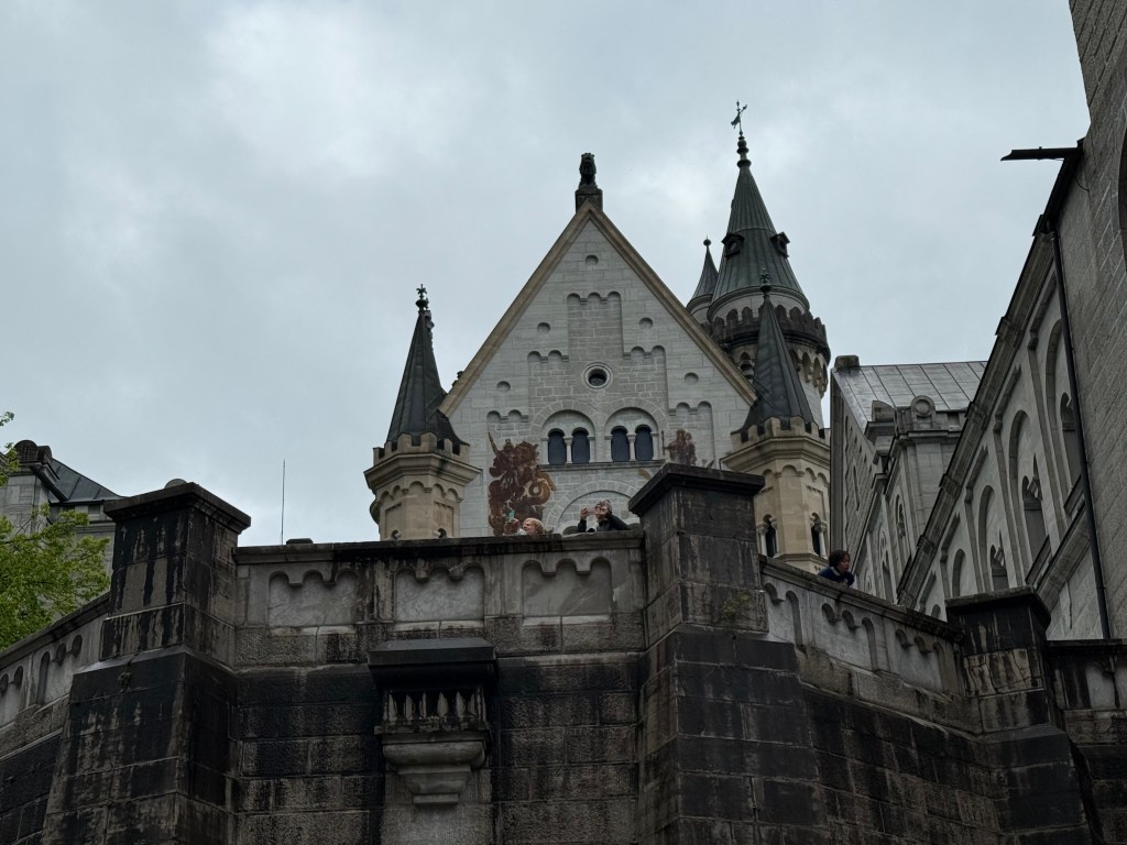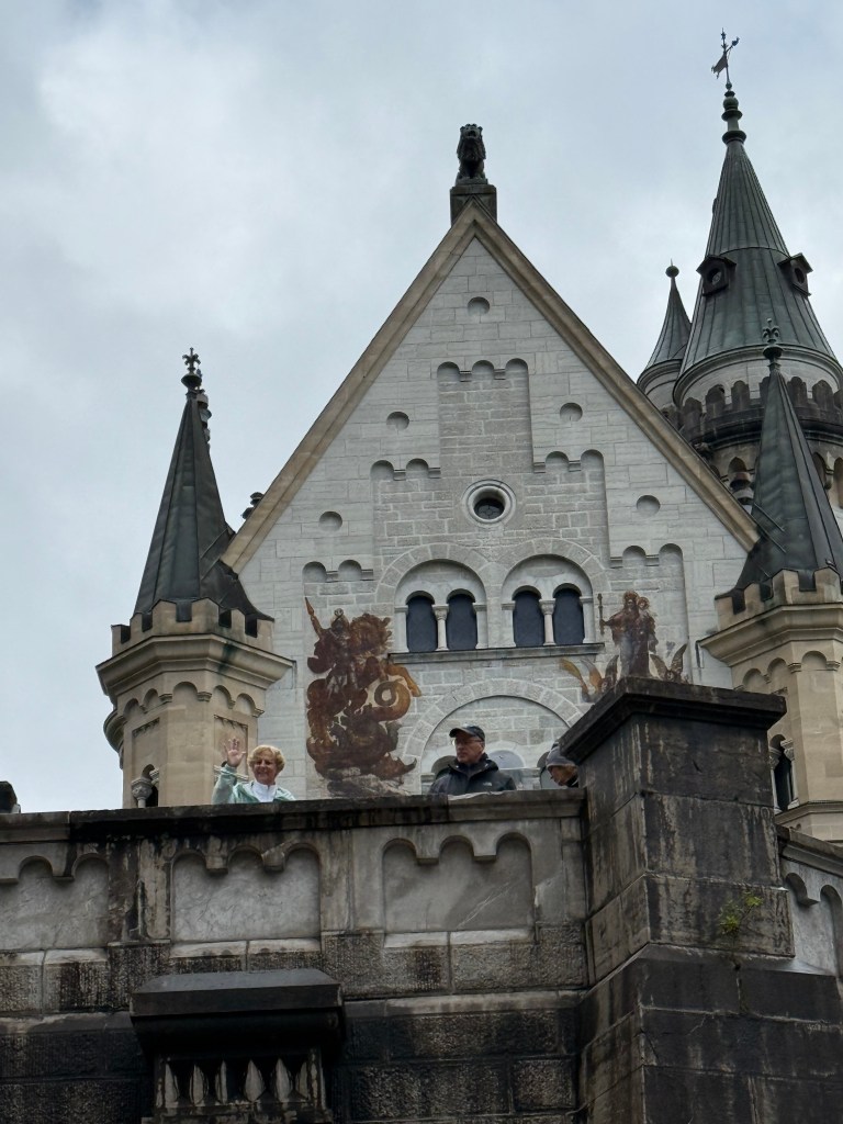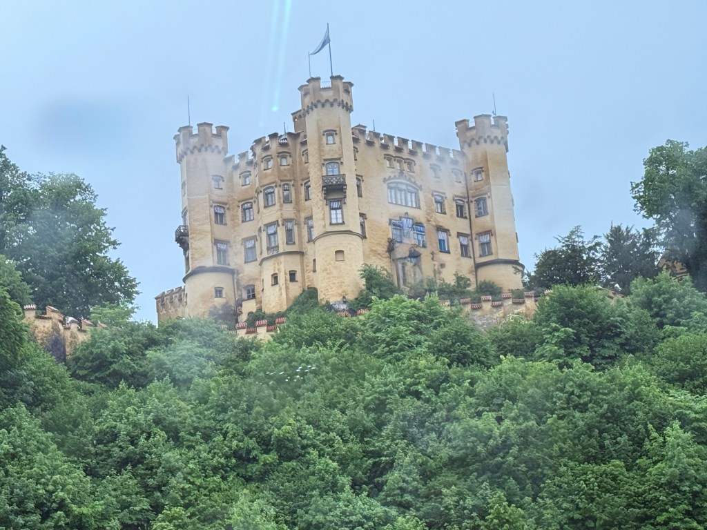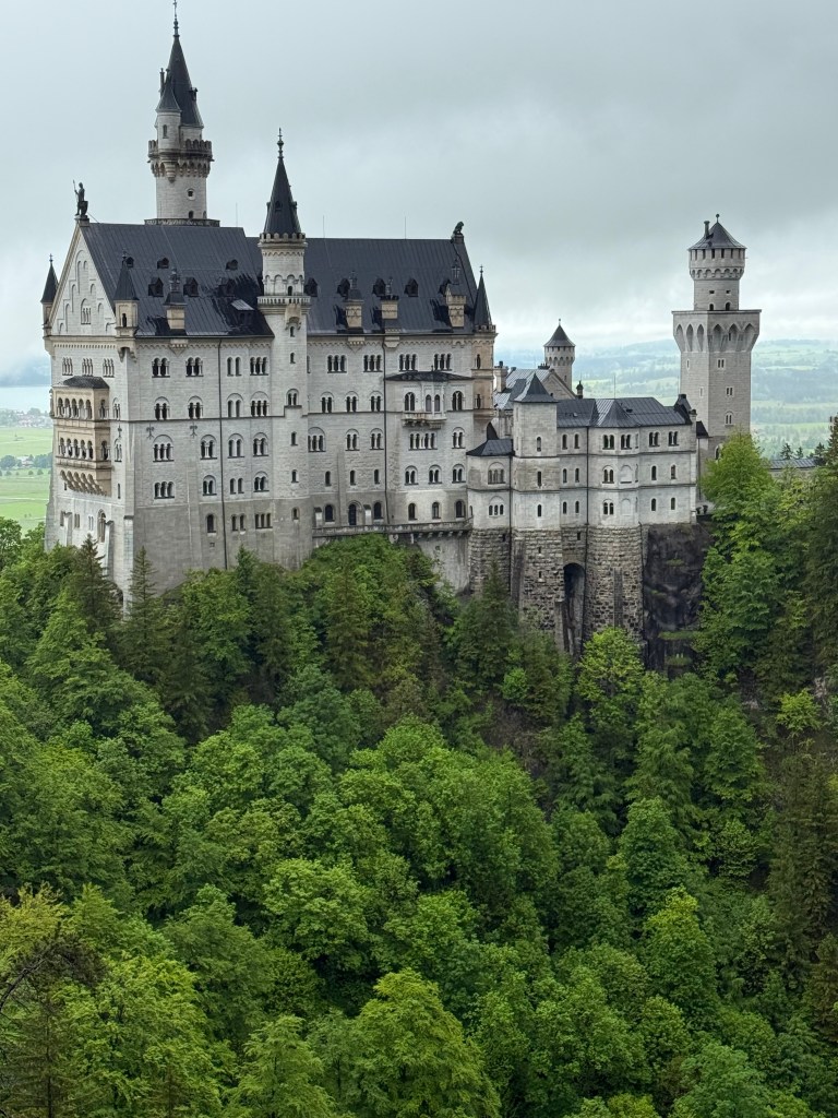 The drive was short and we made it to the castle but the rain was coming down pretty hard. We opted for a bus ride to the top. The views were spectacular of the castle, the forest, the mountains and the valley below. We had a timed ticket for 12:05 and we e early so we had a cappuccino first in a souvenir mug for 5 euros. The rain stop before we entered the castle. The castle was a vanity project for King Ludwig and he used it briefly as a vacation home before he died in 1886. There are many unfinished rooms but the ones that were completed were quite grandiose. Beautiful but a little over the top. It reminded us of Hearst Castle in California but the location and the dramatic spires were awe inspiring.