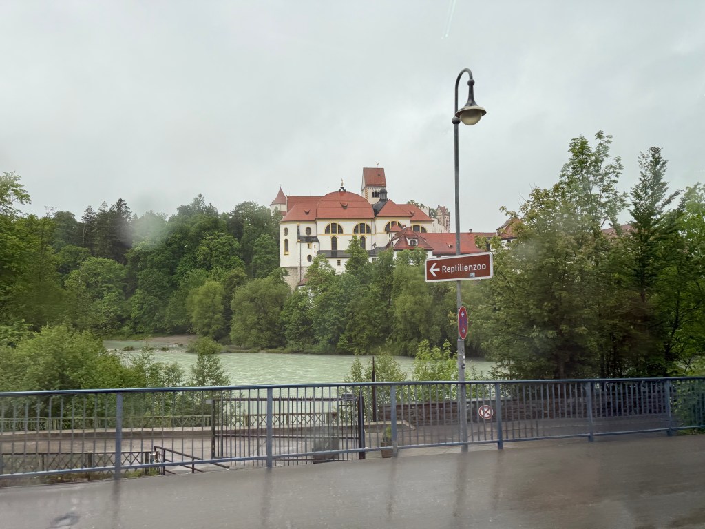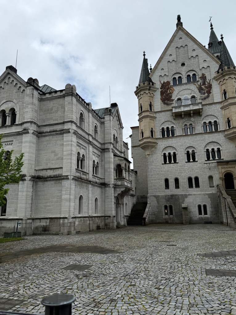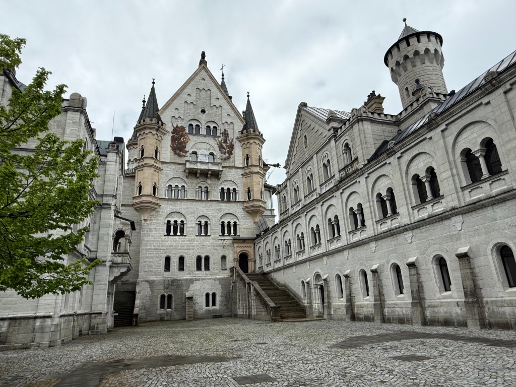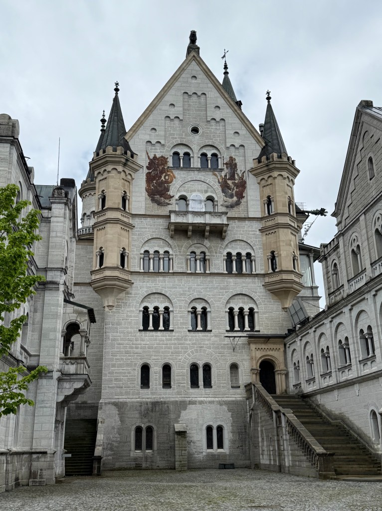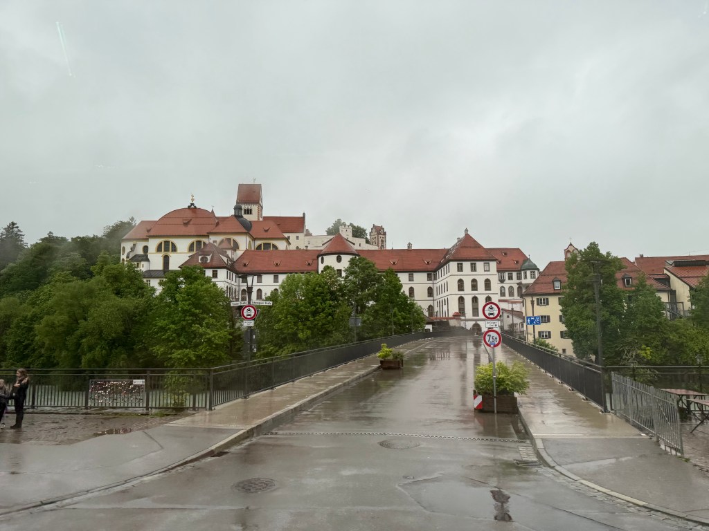 The drive was short and we made it to the castle but the rain was coming down pretty hard. We opted for a bus ride to the top. The views were spectacular of the castle, the forest, the mountains and the valley below. We had a timed ticket for 12:05 and we e early so we had a cappuccino first in a souvenir mug for 5 euros. The rain stop before we entered the castle. The castle was a vanity project for King Ludwig and he used it briefly as a vacation home before he died in 1886. There are many unfinished rooms but the ones that were completed were quite grandiose. Beautiful but a little over the top. It reminded us of Hearst Castle in California but the location and the dramatic spires were awe inspiring.