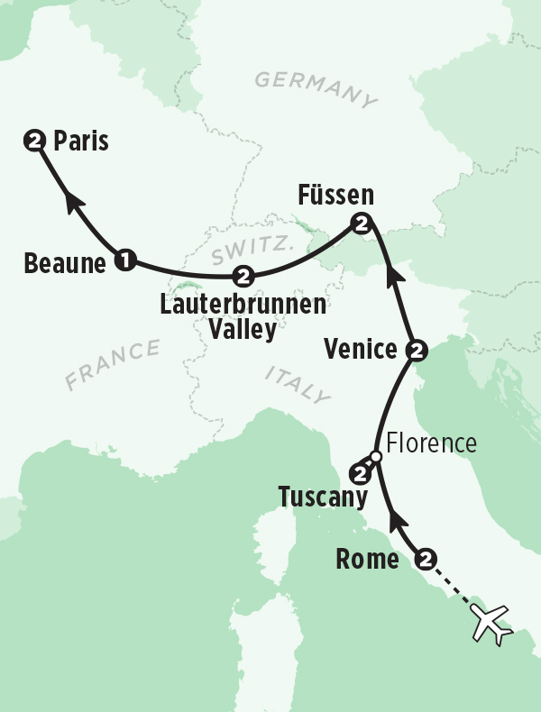 Strenuous walking: 2–8 miles throughout the day with lots of hills, stairs, and uneven terrain. No bus. Sleep in Rome.